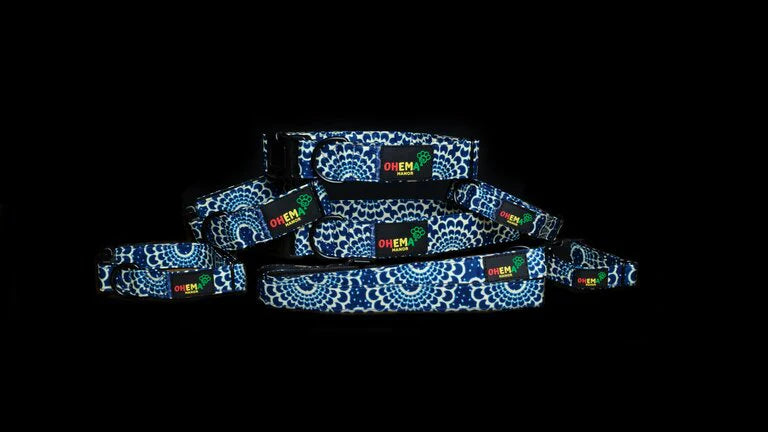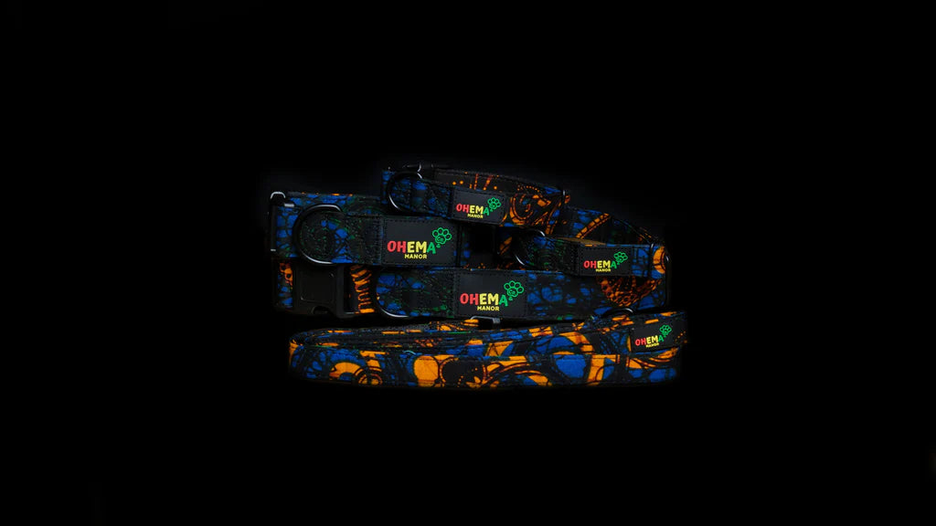 This collar features a stunning mix of sunshine yellow, cobalt blue, and black with an arabesque pattern, adding a pop of color to your pet's wardrobe. The cobalt blue pattern exudes sophistication and elegance.